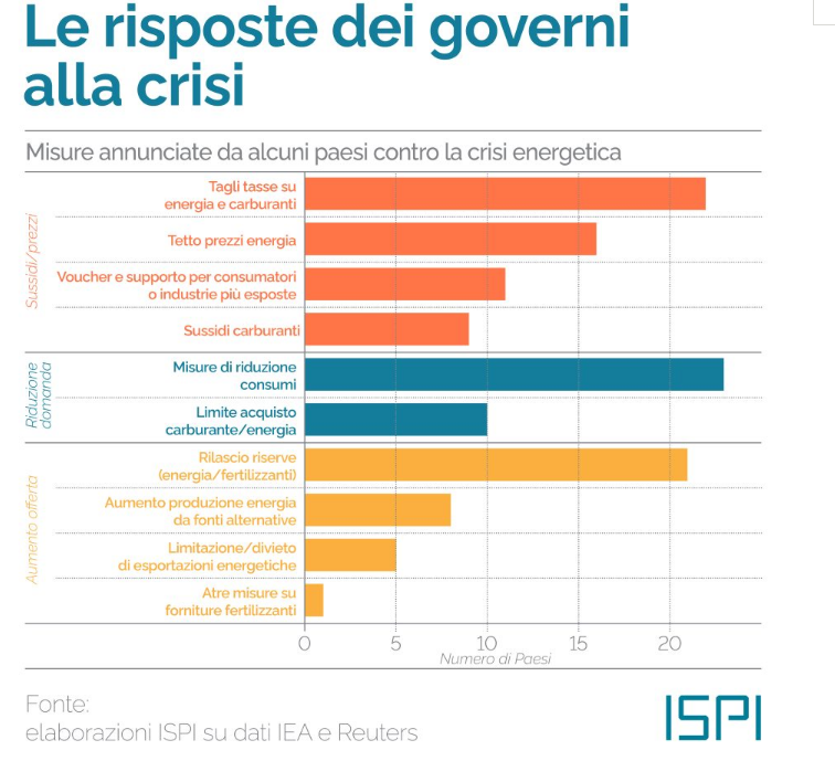 La crisi energetica ha richiamato l’attenzione sui temi della mobilità. Tutti i riflettori sono puntati sulla guerra, su questa crisi (peggiore di quella del 1973 come spiega l’Ispi) e sulle risposte dei governi (riepilogate nel seguente grafico).