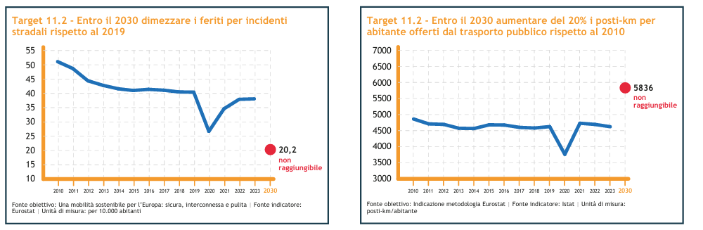 Guardando a Trasporto pubblico locale e ai feriti per incidenti stradali, il Rapporto ASviS Pace giustizia e diritti: pilastri della sostenibilità misura la distanza dagli obiettivi quantitativi identificati relativi al Goal 11 “Città e comunità sostenibili”, rilevando come nessuno dei due riportati in figura potrà essere raggiunto.