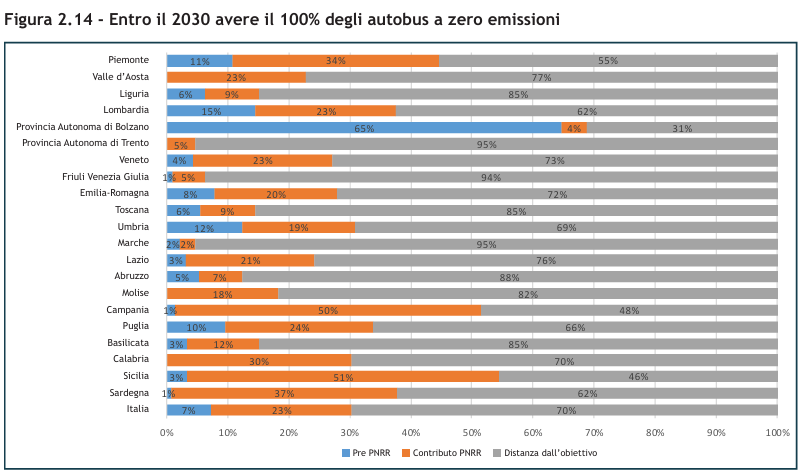 Come riportato invece nel Rapporto ASviS L’impatto del Pnrr sullo sviluppo sostenibile dell’Italia e dei suoi territori, la misura M2C2I4.4.1 del Piano prevede l’acquisto di 3mila autobus a zero emissioni, al fine di migliorare il Trasporto pubblico locale. Nel 2021 erano già previsti fondi per l’acquisto di questa tipologia di autobus, ma la sua percentuale risultava molto contenuta. Il contributo del Pnrr è complessivamente positivo, seppur limitato: nessuna Regione, a eccezione di Campania, Sicilia e Provincia autonoma di Bolzano (anche grazie a ulteriori finanziamenti), registrerà una percentuale di avvicinamento all’obiettivo superiore al 50%. Nella seguente tabella è possibile vedere la situazione pre-Pnrr, il contributo del Pnrr e la distanza dall’obiettivo di avere entro il 2030 il 100% degli autobus a zero emissioni.