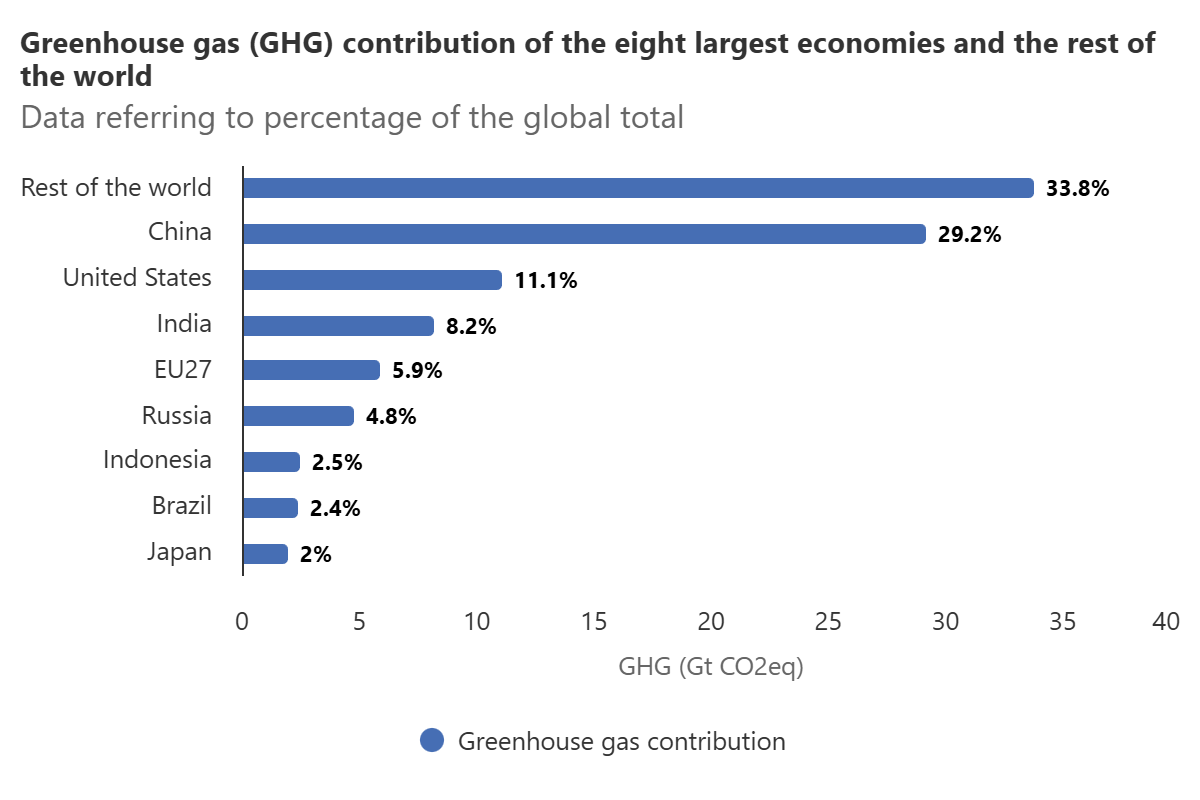 Nel 2024 le emissioni di gas serra hanno toccato le 53,2 Gt di CO₂. Quasi tutti i principali emettitori hanno ridotto le proprie emissioni per unità di Pil. Il settore energetico resta quello più problematico. 12/01/26