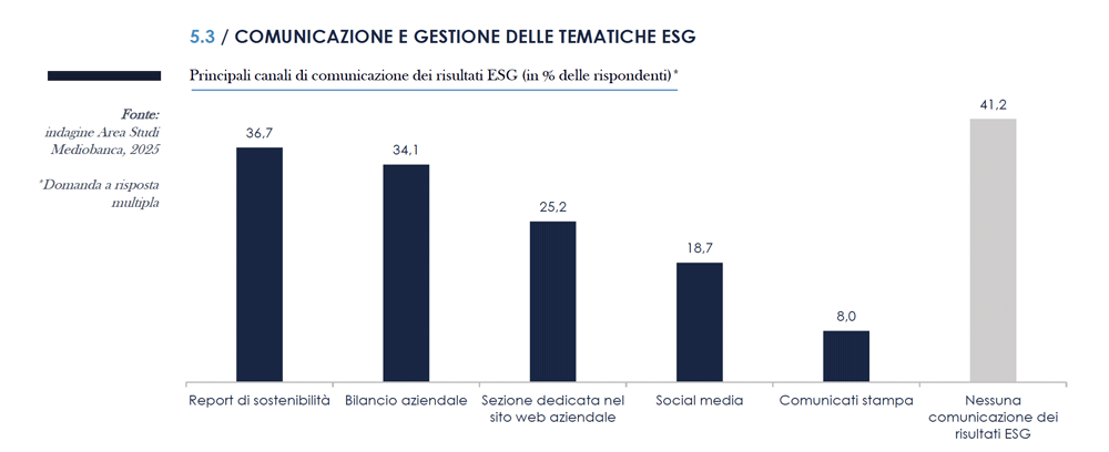 Sul piano della governance, il report evidenzia un gap comunicativo importante: il 58,4% delle imprese comunica le proprie azioni Esg solo in modo saltuario o minimale e appena il 7% pubblica un bilancio di sostenibilità. Ciò segnala una mancanza di strutturazione nella rendicontazione e una difficoltà a tradurre l’impegno Esg in strumenti chiari per stakeholder, clienti e investitori.