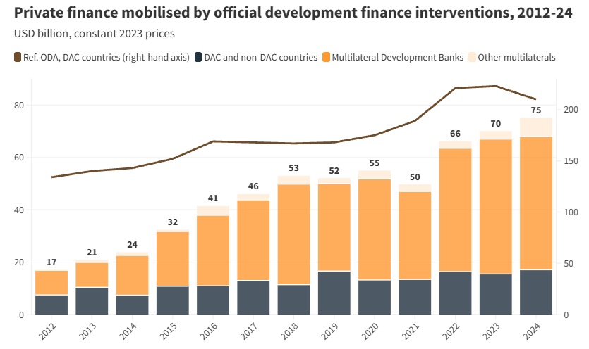 In controtendenza rispetto alla contrazione degli aiuti bilaterali, le uscite dai bilanci principali delle organizzazioni multilaterali, comprendenti impegni concessionali (prestiti o strumenti finanziari concessi a condizioni più favorevoli del mercato) e non concessionali, hanno raggiunto 271 miliardi di dollari, con un aumento del 4% rispetto al 2023. Parallelamente, il peso del settore privato nel finanziamento allo sviluppo continua ad ampliarsi: tra il 2012 e il 2024 le risorse mobilitate attraverso interventi ufficiali hanno superato i 600 miliardi di dollari, con un picco di 77 miliardi registrato proprio nel 2024. Si tratta di dinamiche che indicano un progressivo riequilibrio tra aiuto pubblico diretto e strumenti finanziari più complessi.
