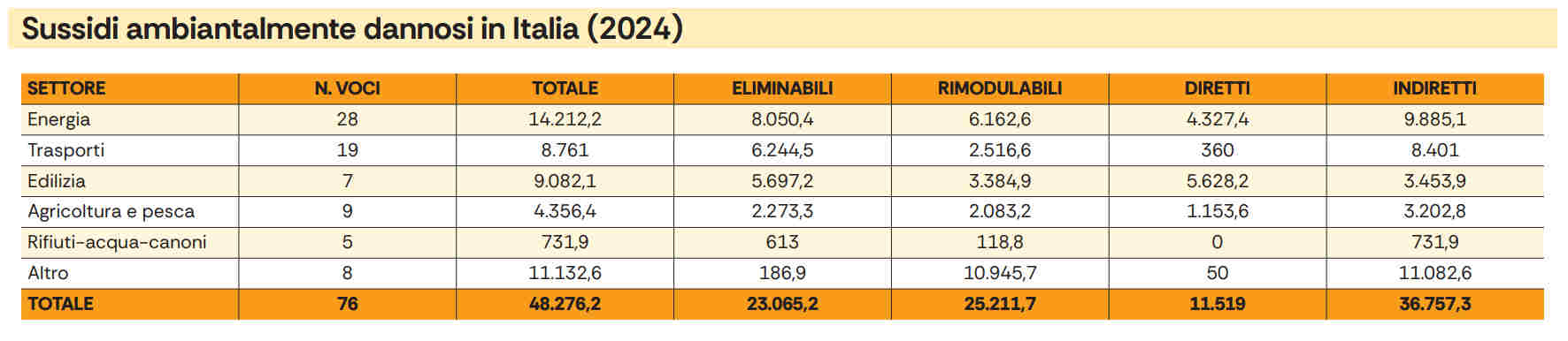 Alla fine del 2024 la fotografia dei sussidi ambientalmente dannosi (Sad) in Italia resta impietosa. Secondo lo studio di Legambiente, che ha censito 76 voci di sussidi, sono 48,3 i miliardi di euro che lo scorso anno il nostro Paese ha destinato ad attività che, direttamente o indirettamente, hanno colpito le risorse naturali incidendo così sul benessere collettivo. Si tratta di una cifra che, nonostante gli impegni formali dell’Italia sulla transizione ecologica, continua a consolidare modelli di produzione e consumo incompatibili con gli obiettivi ambientali e climatici.