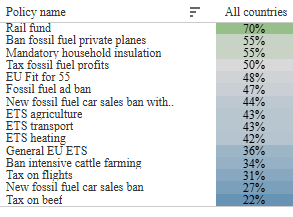 A riscuotere il maggior consenso, come emerge dalla figura sotto, è la creazione di un Fondo ferroviario europeo, pensato per ampliare la rete e dimezzare il costo dei biglietti: piace a 7 cittadini su 10 in Europa (70%) e a 3 su 4 in Italia (75%). Al secondo posto il divieto dei jet privati a combustibili fossili dal 2035, sostenuto da quasi 2 italiani su 3 (64%), circa dieci punti sopra la media europea.