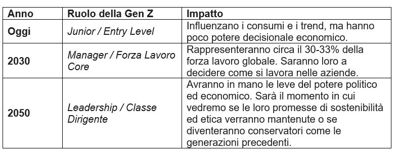 Se guardiamo al loro percorso nel tempo, riassunto nella schema qui sotto, il ruolo della Gen Z cambierà radicalmente già nei prossimi vent’anni.