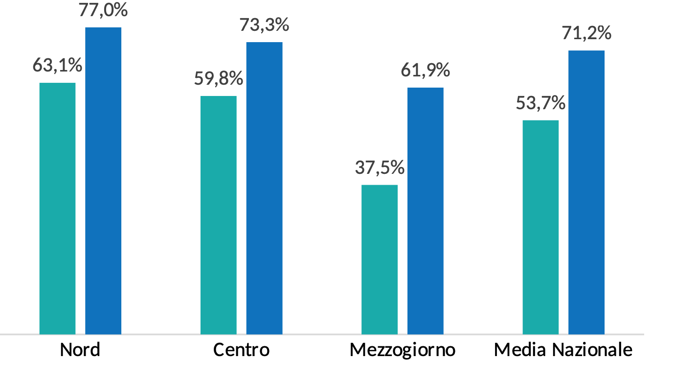 Il Rapporto sottolinea come le infrastrutture sociali per la vita familiare costituiscano un ostacolo determinante alla parità. La copertura degli asili nido si ferma al 30% su base nazionale, con picchi al ribasso del 17,4% nel Mezzogiorno, lontana dall’obiettivo europeo del 45% al 2030. Questo deficit si traduce in carriere interrotte, riduzione delle ore lavorative e rinunce professionali che alimentano una child penalty superiore al 30%. Il congedo di paternità obbligatorio resta fermo ai 10 giorni previsti dalla normativa europea, con un utilizzo del 64,5% ma con fortissimi divari territoriali: 76% al Nord e 44% al Sud. Le esperienze degli altri Paesi dimostrano che congedi più equi e non trasferibili, insieme a servizi universali per accudire i bambini, possono ridurre drasticamente il divario occupazionale.
