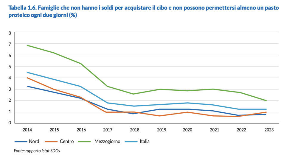 Questi dati si inseriscono in un quadro più ampio di povertà economica: nel 2024 in Italia 2,2 milioni di famiglie si trovavano in povertà assoluta (8,4% del totale) e 5,7 milioni di individui in condizioni di grave deprivazione economica. La povertà alimentare rappresenta quindi una delle manifestazioni più immediate e concrete della fragilità socioeconomica.