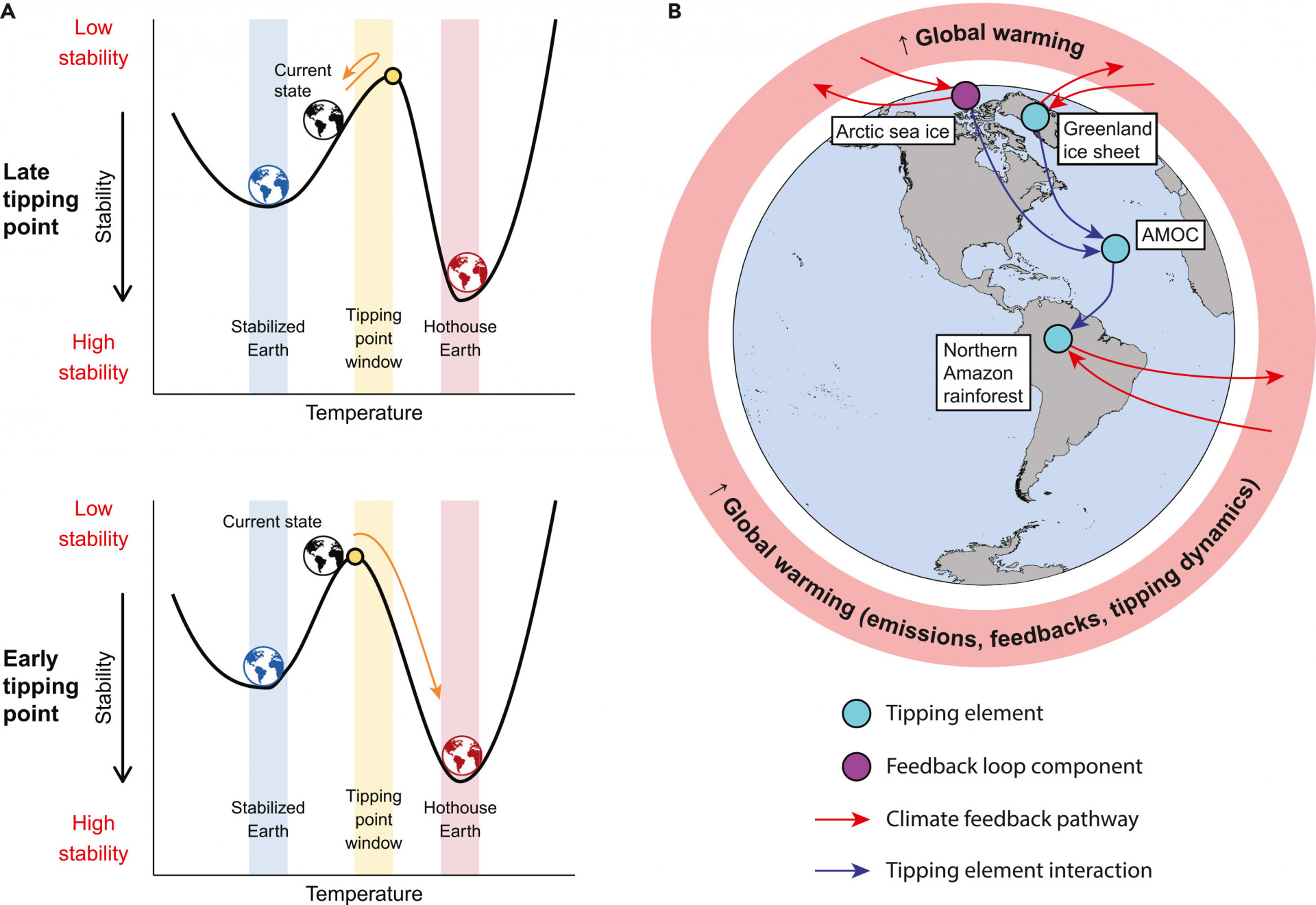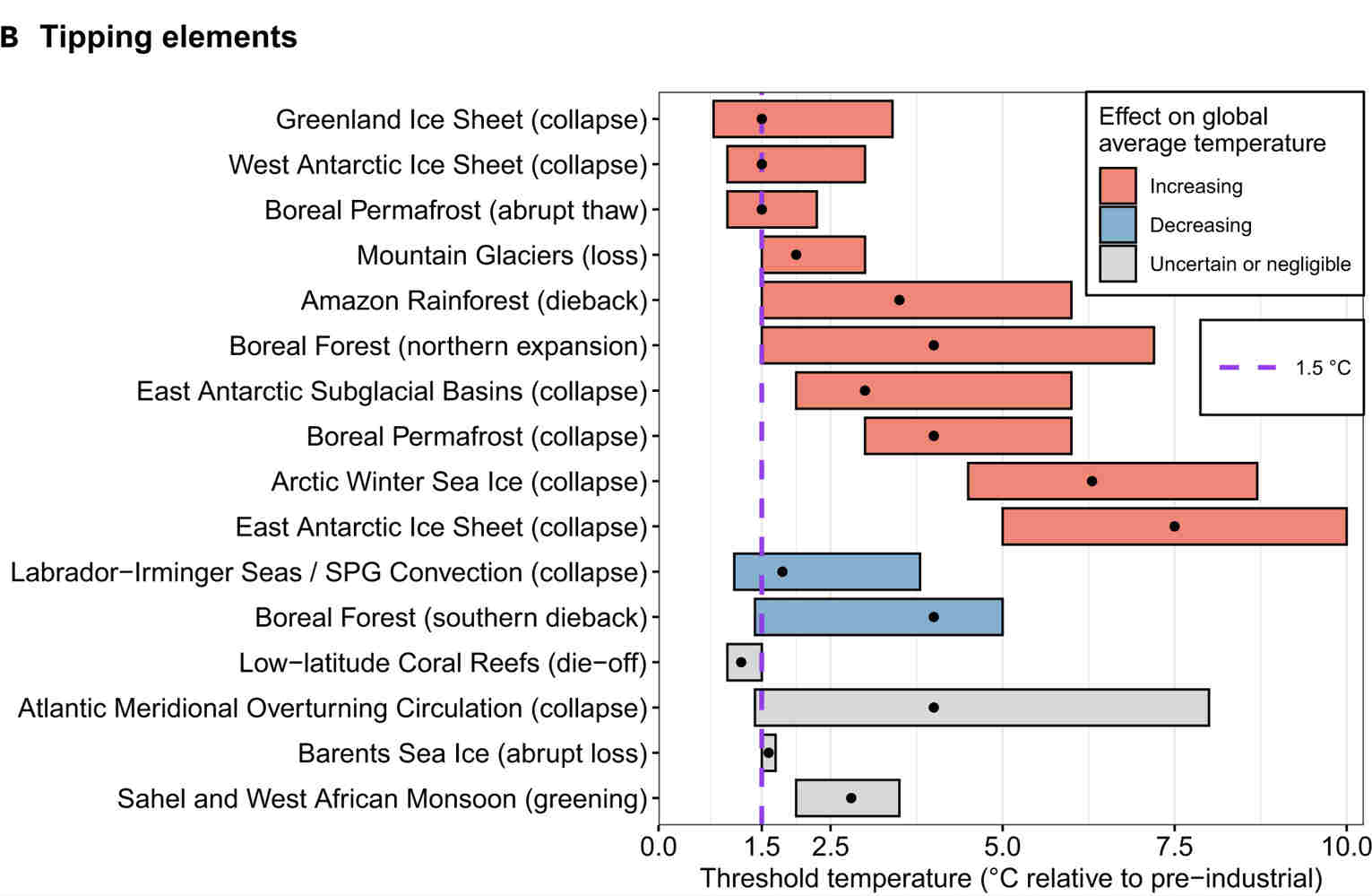 Una delle preoccupazioni che emergono dallo studio riguarda l’attivazione di alcuni tipping points climatici. La letteratura scientifica ne identifica 16 principali, dieci dei quali potrebbero contribuire pesantemente all’aumento della temperatura globale una volta innescati. Tra i punti di non ritorno ritenuti più vicini a una possibile soglia critica figurano la calotta glaciale della Groenlandia e quella dell’Antartide occidentale, il permafrost boreale, i ghiacciai montani e porzioni della foresta Amazzonica.