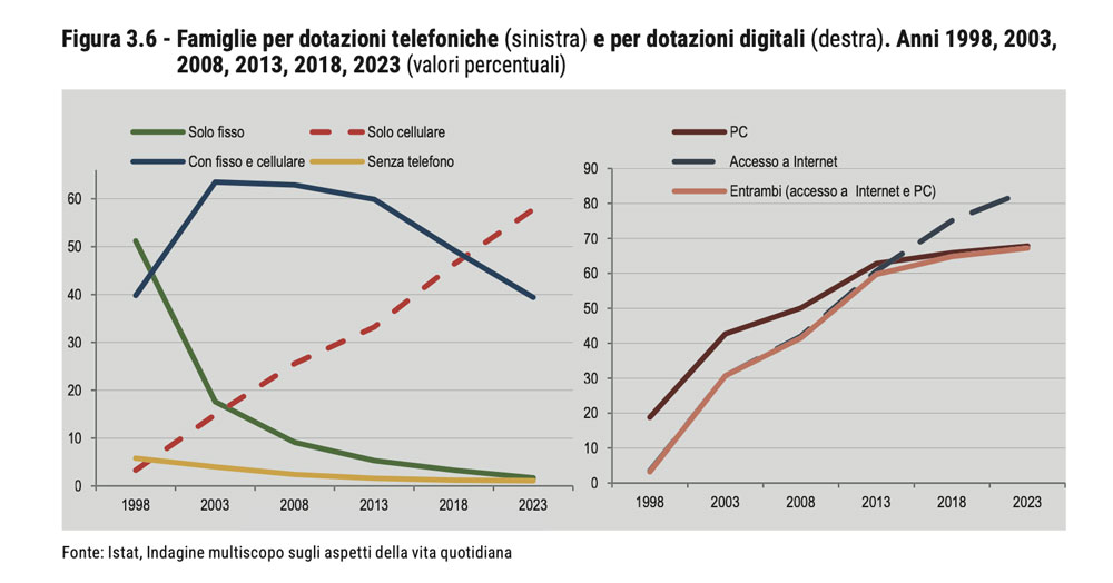 La diffusione delle tecnologie digitali ha trasformato in profondità le modalità di comunicazione e accesso ai servizi. Nel tempo si passa da un uso limitato e legato alla linea fissa a una connessione sempre più diffusa, mobile e continua, con effetti diretti sulla vita quotidiana.