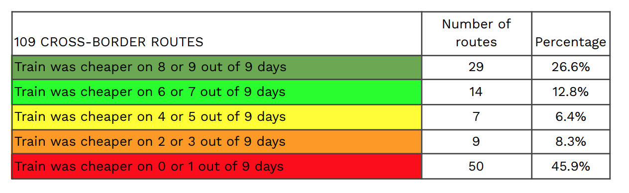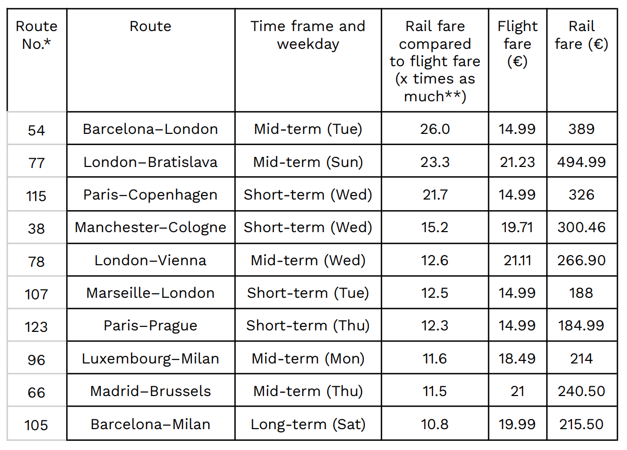 Il Rapporto prende in esame 142 collegamenti in 31 Paesi europei, di cui 109 transfrontalieri. Sul 54% di queste tratte i biglietti aerei risultano mediamente più economici dei corrispettivi ferroviari.