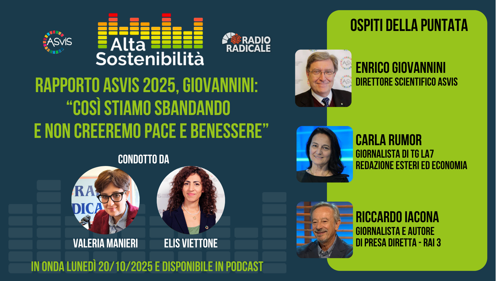 Ad Alta sostenibilità, in onda lunedì 20 ottobre alle 12.30 e disponibile in podcast. Ospiti della puntata: Enrico Giovannini, Direttore scientifico ASviS, economista, Riccardo Iacona, giornalista, autore di Presa Diretta, Rai 3 e Carla Rumor, giornalista di TG La7, Redazione Esteri ed Economia. Conducono Valeria Manieri ed Elis Viettone.