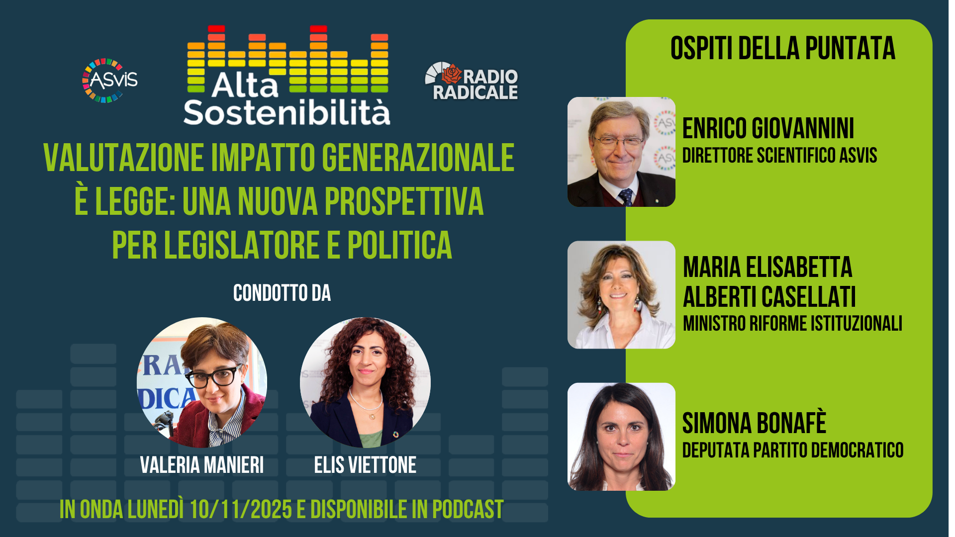 Ad Alta sostenibilità, in onda lunedì 10 novembre alle 12.30 e disponibile in podcast. Ospiti della puntata: Enrico Giovannini, direttore scientifico ASviS, economista, Maria Elisabetta Alberti Casellati, ministro per le Riforme istituzionali e Simona Bonafè, deputata Partito Democratico. Conducono Valeria Manieri ed Elis Viettone.
