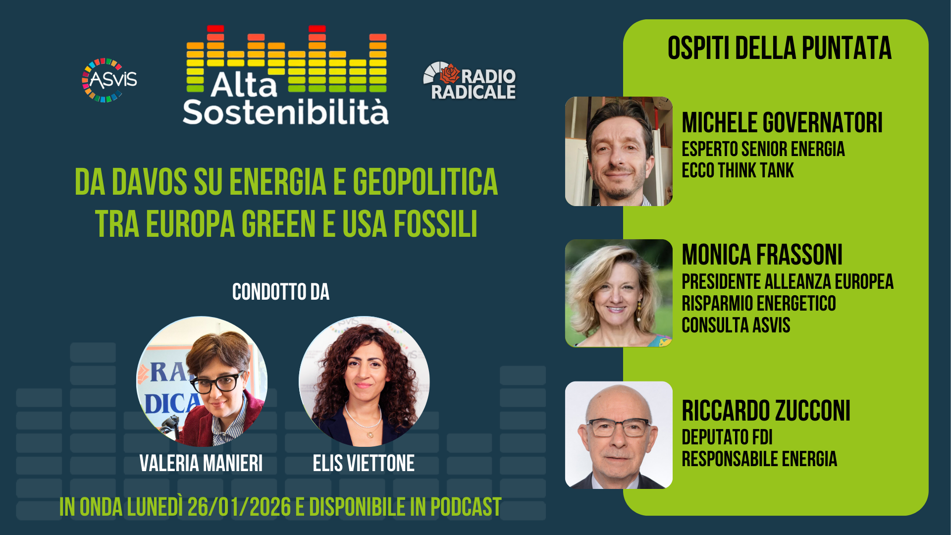 Ad Alta Sostenibilità, in onda lunedì 26 gennaio alle 12.30 e disponibile in podcast. Ospiti della puntata: Michele Governatori, Esperto Senior Energia, Ecco think tank, Monica Frassoni, Presidente alleanza europea per il Risparmio energetico, consulta ASviS e Riccardo Zucconi, Deputato Fdi, responsabile Energia. Conducono Valeria Manieri ed Elis Viettone.