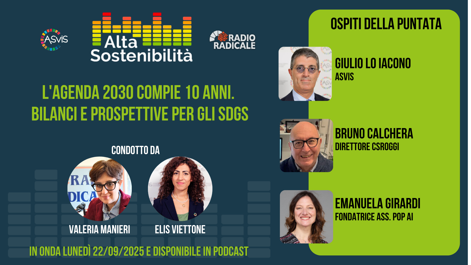 Ad Alta sostenibilità, in onda lunedì 22 settembre alle 12.30 e disponibile in podcast. Ospiti della puntata: Giulio Lo Iacono, segretario generale dell’ASviS, Bruno Calchera, direttore responsabile CSRoggi ed Emanuela Girardi, fondatrice di Pop AI (Popular Artificial Intelligence). Conducono Valeria Manieri ed Elis Viettone.