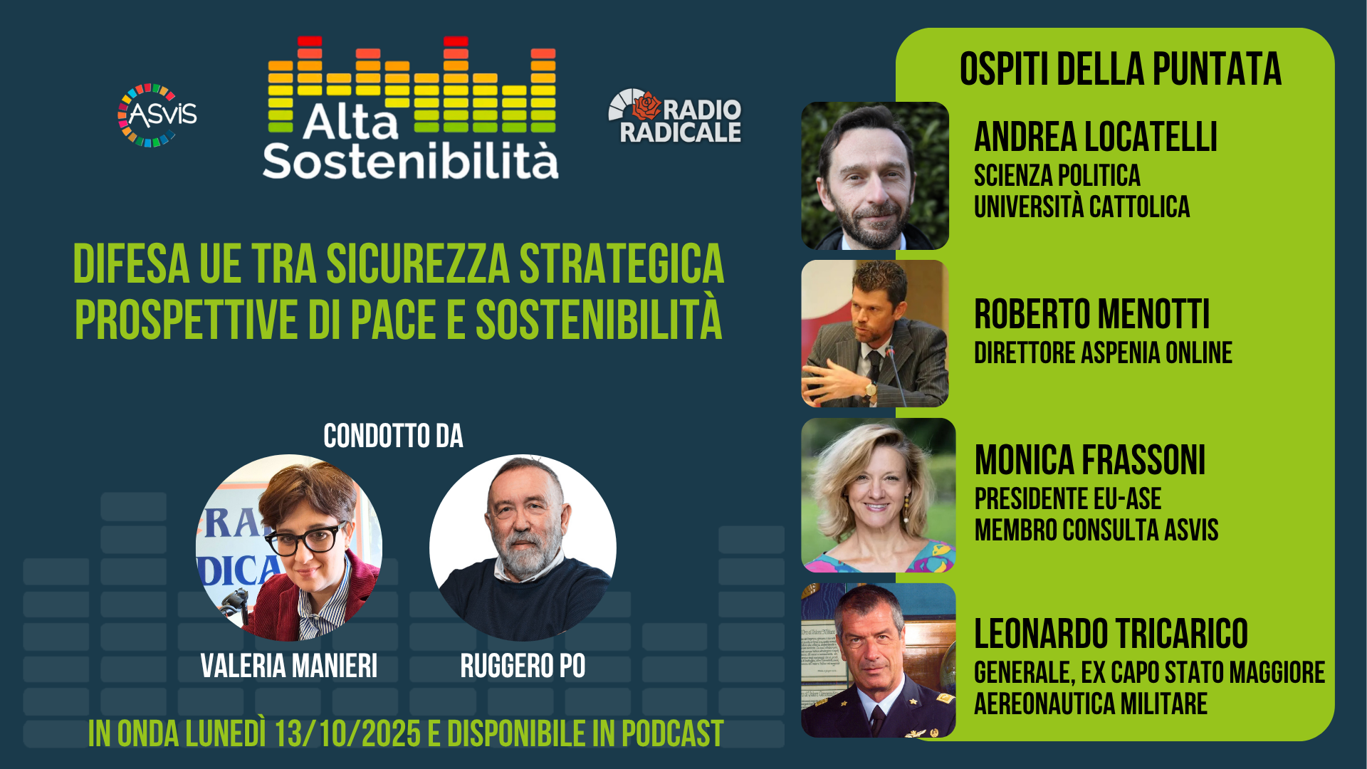 Ad Alta sostenibilità, in onda lunedì 13 ottobre alle 12.30 e disponibile in podcast. Ospiti della puntata: Andrea Locatelli, professore di Scienza Politica presso l'università Cattolica, Roberto Menotti, direttore di Aspenia online, rivista di Aspen Italia, Monica Frassoni, Presidente European allinace to save energy, membro della consulta Asvis e il Generale Leonardo Tricarico, già capo di Stato Maggiore dell’Aeronautica Militare. Conducono Valeria Manieri e Ruggero Po.